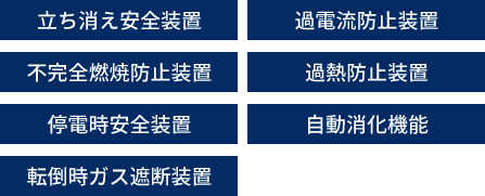 ぶつかったときや地震時にも安心な「転倒時ガス遮断装置」や、運転中にバーナーの炎が消えた場合にガスを止め、運転を停止する「立消え安全装置」といった安全機能を備えているため、万一の事態にもバッチリです。
