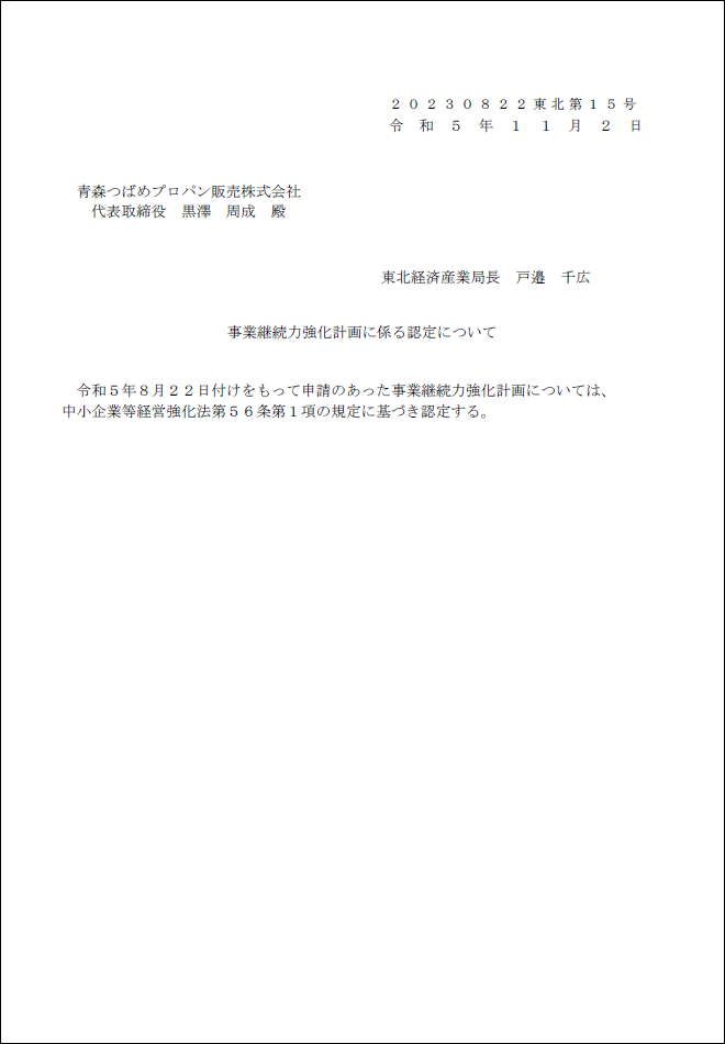 さて、表題に関しまして、このたび弊社は、令和5年8月22日付けで「事業継続力強化計画」の認定を受けましたのでご報告申し上げます。