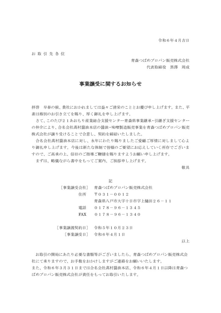 合名会社髙村醤油本店に対し、永年にわたり賜りましたご愛顧ご厚情に対しまして心より御礼申し上げます。今後は新たな体制で皆様のご要望にお応えしていく所存でございますので、ご高承の上、倍旧のご指導ご鞭撻を賜りますようよろしくお願い申し上げます。