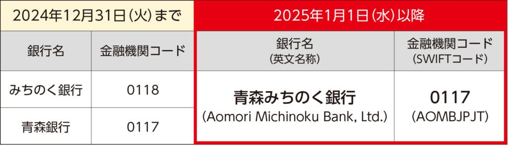 「青森みちのく銀行」に、金融機関コードが「0117」に変更となります。