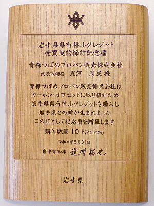 令和4年5月31日、岩手県県有林J-クレジット売買契約締結記念盾贈呈式に参加し、記念盾を拝受致しました。