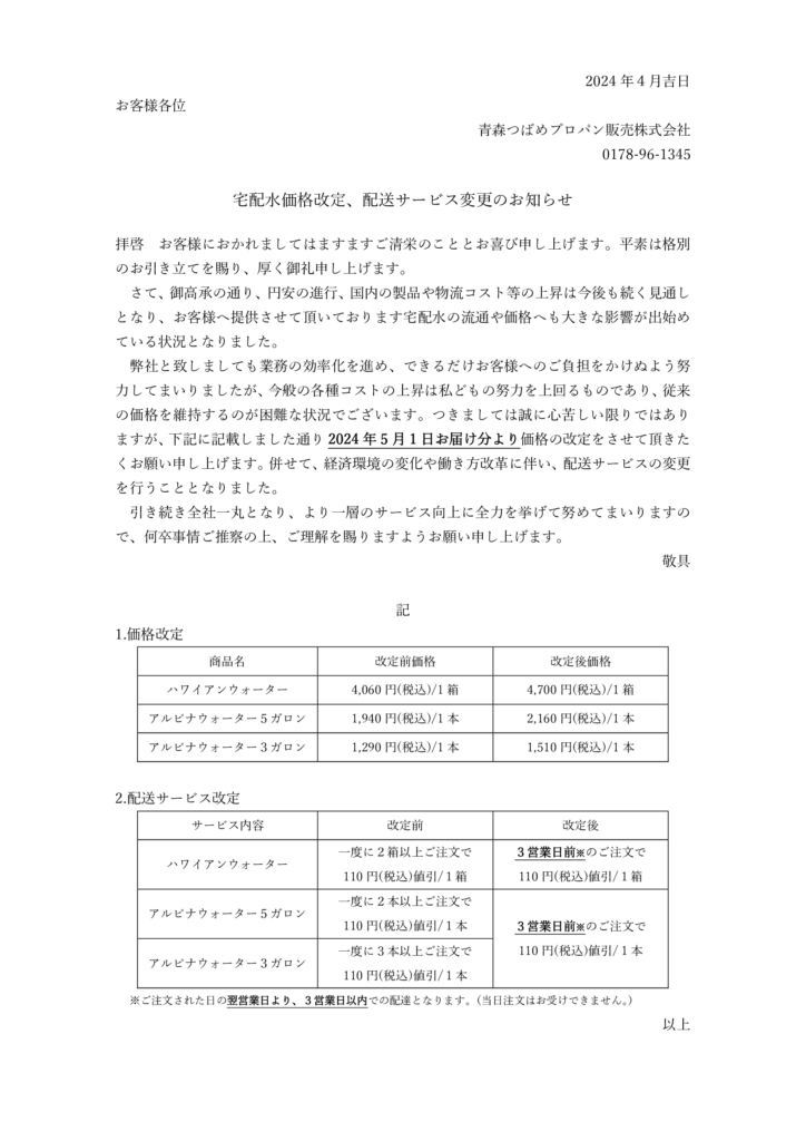 通り2024年5月1日お届け分より価格の改定をさせて頂きたくお願い申し上げます。併せて、経済環境の変化や働き方改革に伴い、配送サービスの変更を行うこととなりました。
