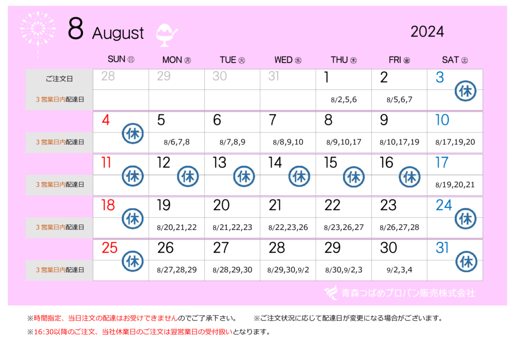【8月】宅配水配達日カレンダー