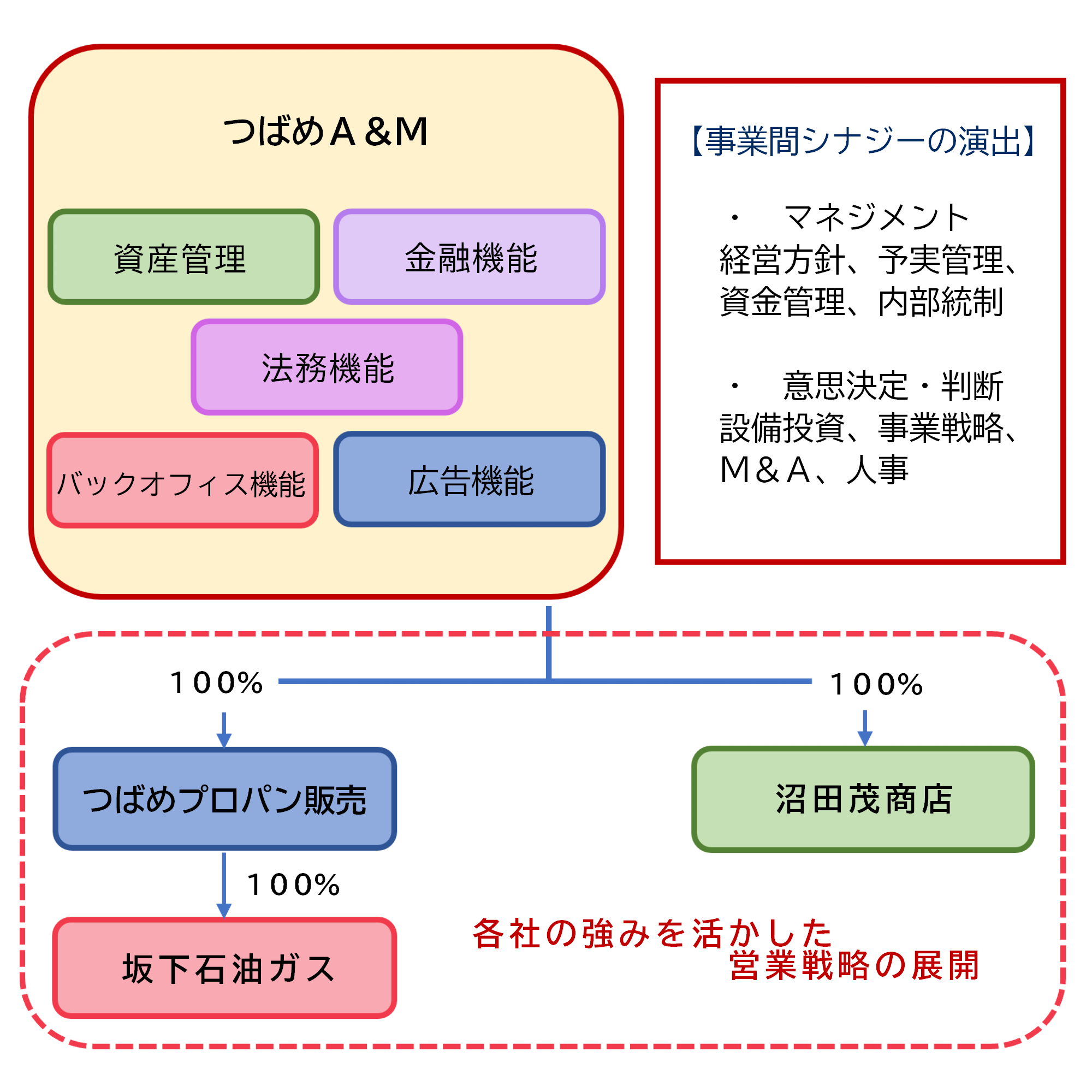 上記の目的実現に向け、株式交換を実施し、つばめアセット・アンド・マネジメントを完全親会社、青森つばめプロパン販売を完全子会社とする 100%資本関係を構築します。また、青森つばめプロパン販売が保有する有限会社沼田茂商店の発行済株式の全てを当社へ現物配当し、つばめアセット・アンド・マネジメントを完全親会社、有限会社沼田茂商店を完全子会社とする 100%資本関係を構築します。